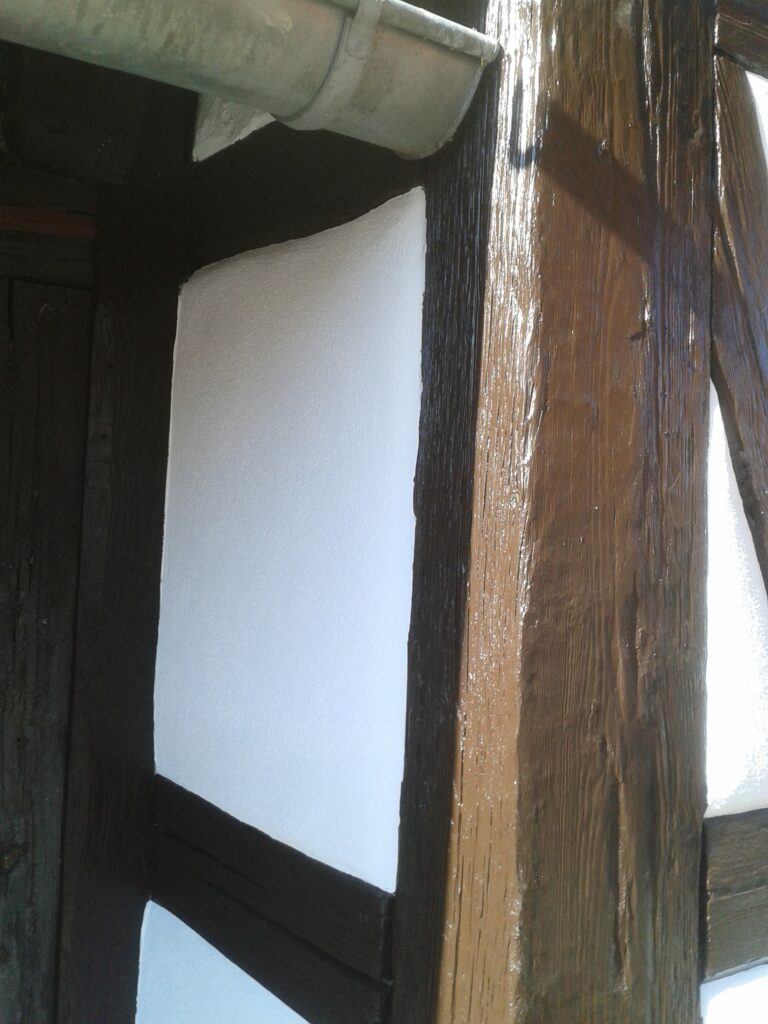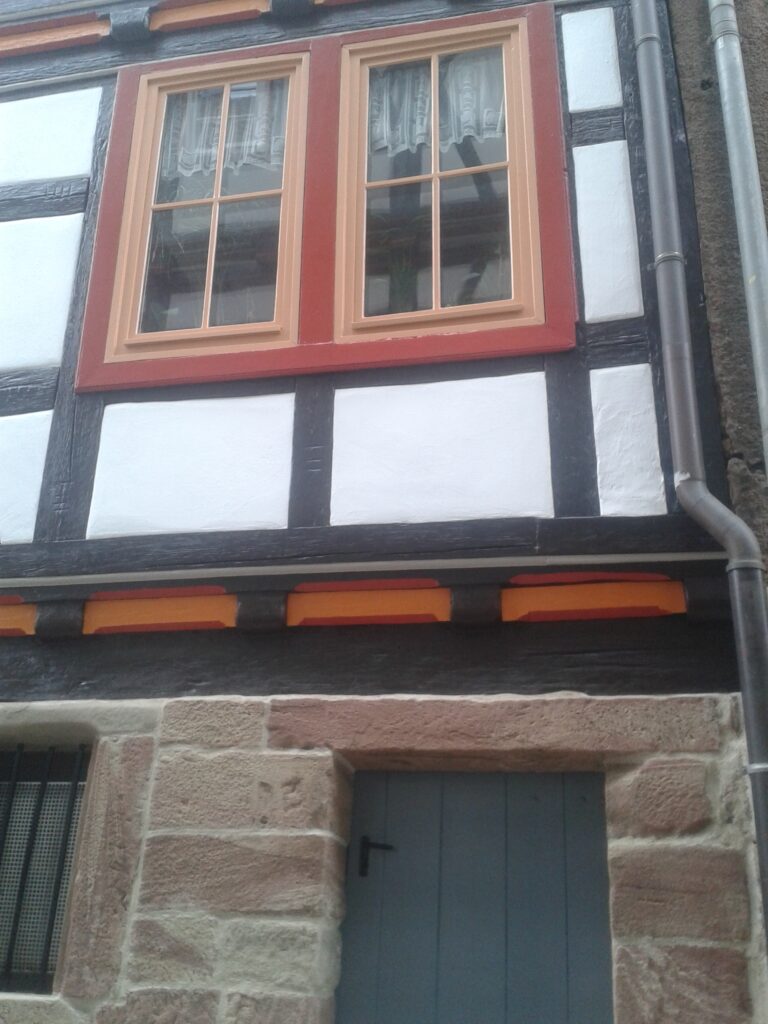 Ausgeführte Arbeiten: Entfernen und Einsetzen von kleineren schadhaften Holzteilen. Die Struktur der neu eingesetzten Holzteile sowie komplett neu eingesetzten Fachwerkbalken an vorhandene Holzstuktur anpassen, Reinigung der Fachwerkteile, Neuaufbau bzw. Überarbeitung der Putzfelder, Anstricharbeiten, Absetzten der Zierleisten an Fenstern und Gesims.